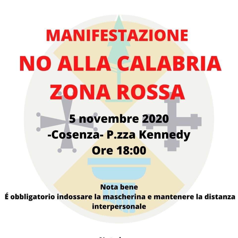 COSENZA :: 05/11/2020 :: Monta in Calabria la protesta contro la scelta del Governo di dichiarare la regione “zona rossa”, gruppi di cittadini stanno organizzando iniziative per manifestazione il dissenso a questa scelta. Oggi, giovedì 5 novembre, alle ore 18.00, si terrà a piazza Kennedy a Cosenza una manifestazione pacifica chiamata “No alla Calabria zona rossa”.