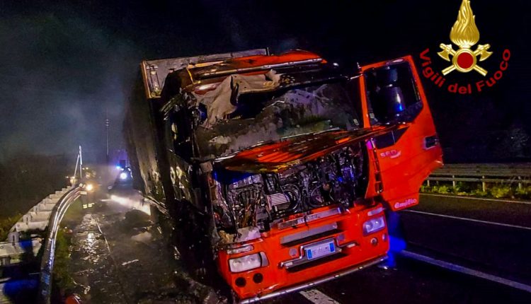 MONTALTO :: 20/02/2021 :: Questa sera i vigili del fuoco del Comando di Cosenza sono intervenuti sull’A2 (km 252 in direzione nord) fra gli svincoli di Cosenza nord e Montalto per l’incendio di un tir che trasportava agrumi. L’autista appena accortosi delle fiamme ha abbandonato il veicolo mettendosi in salvo. Il tempestivo intervento della squadra ha evitato la propagazione delle fiamme all’intero veicolo. Sul posto la polizia stradale e l’Anas per la gestione della viabilità e per il ripristino della normale circolazione.